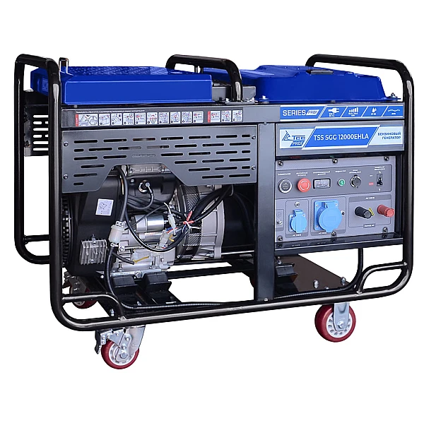 Бензиновый генератор TSS SGG 12000EHLA - мощная электростанция на 12 кВт с электростартером, которая позволяет реализовать различные варианты подключения нагрузки и отличается высокой мобильностью за счет колесного комплекта.
