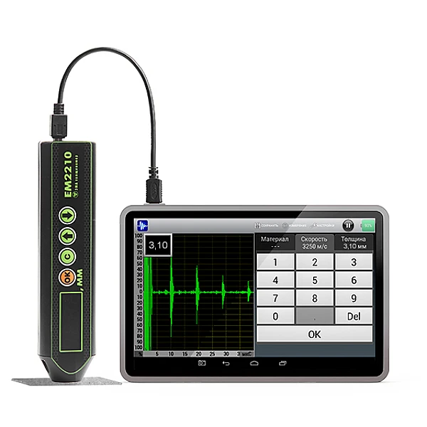 Подключение планшета, смартфона или другого устройства на базе ОС Android, позволяет расширить возможности толщиномера EM2210 до уровня современного дефектоскопа, с возможностью отображения и сохранения А-скана, B-скана, возможностью работать со стробами, выбирать режим измерения толщины, параметры обработки сигнала и т.д.