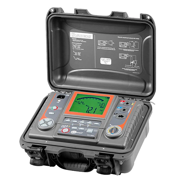 MIC-5005 – цифровой мегаомметр, предназначенный для испытания электрической прочности изоляции электроустановок систем электроснабжения, а также измерения сопротивления изоляции кабельных линий, проводов, обмоток трансформаторов, двигателей, других электро- и телекоммуникационных установок. Максимальное измерительное напряжение составляет 5000 В постоянного тока, а диапазон измеряемого сопротивления ограничен величиной в 15 ТОм. Установка трёх интервалов времени позволяет автоматически рассчитывать коэффициент абсорбции (увлажнённости), поляризации (старения) и коэффициент разряда диэлектрика. В процессе измерения сопротивления изоляции происходит измерение ёмкости. Электромагнитные помехи, благодаря встроенному цифровому фильтру, не влияют на результат измерений.