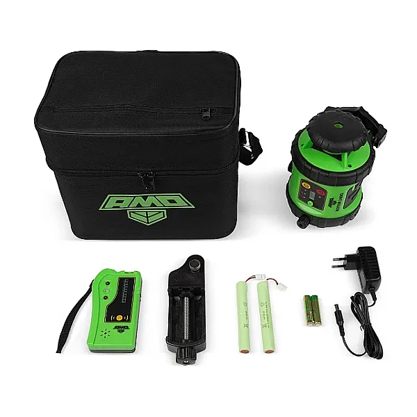 Ротационный лазерный нивелир AMO ROTOR 240G поставляется в расширенной комплектации. В комплект входит: устройство, приемник лазерного излучения, пульт ДУ, кронштейны для вертикальной и наклонной установки. Прибор проецирует горизонтальную плоскость разверткой на 360°, вертикальный луч и точку зенита. Модель оснащена мощным ярким лазером зеленого цвета, который отлично виден как в помещениях, так и на улице. Дальность действия с приёмником составляет 240 м. Лазерный уровень работает от шести батареек АА или Ni-MH-аккумуляторов.
